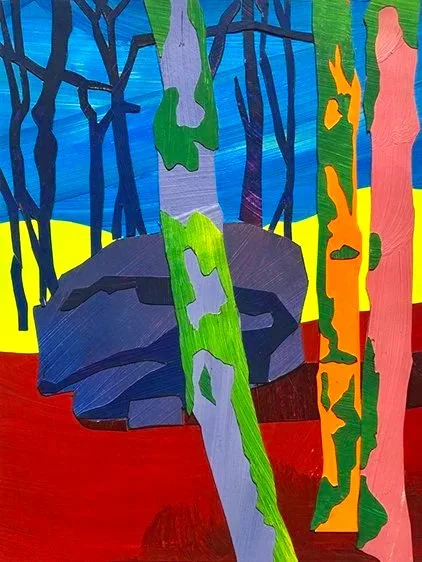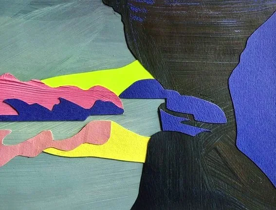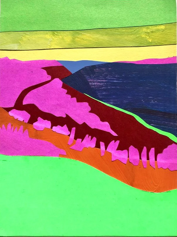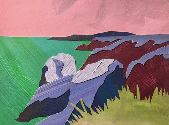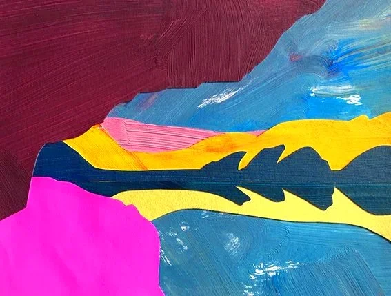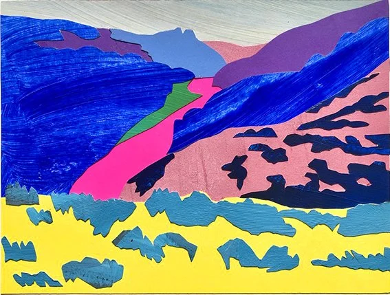 Mes pérégrinations m’ont offert de nombreux points de vue sur des paysages différents : mer, montagne, campagne, bois… ma bibliothèque photographique déborde. Cette série est le moyen de fixer à la colle le souvenir d’un lieu rencontré, éprouvé, ressenti. Un horizon, une lumière, un relief, une ambiance recomposés grâce à la récupération de papiers peints à l’acrylique.
